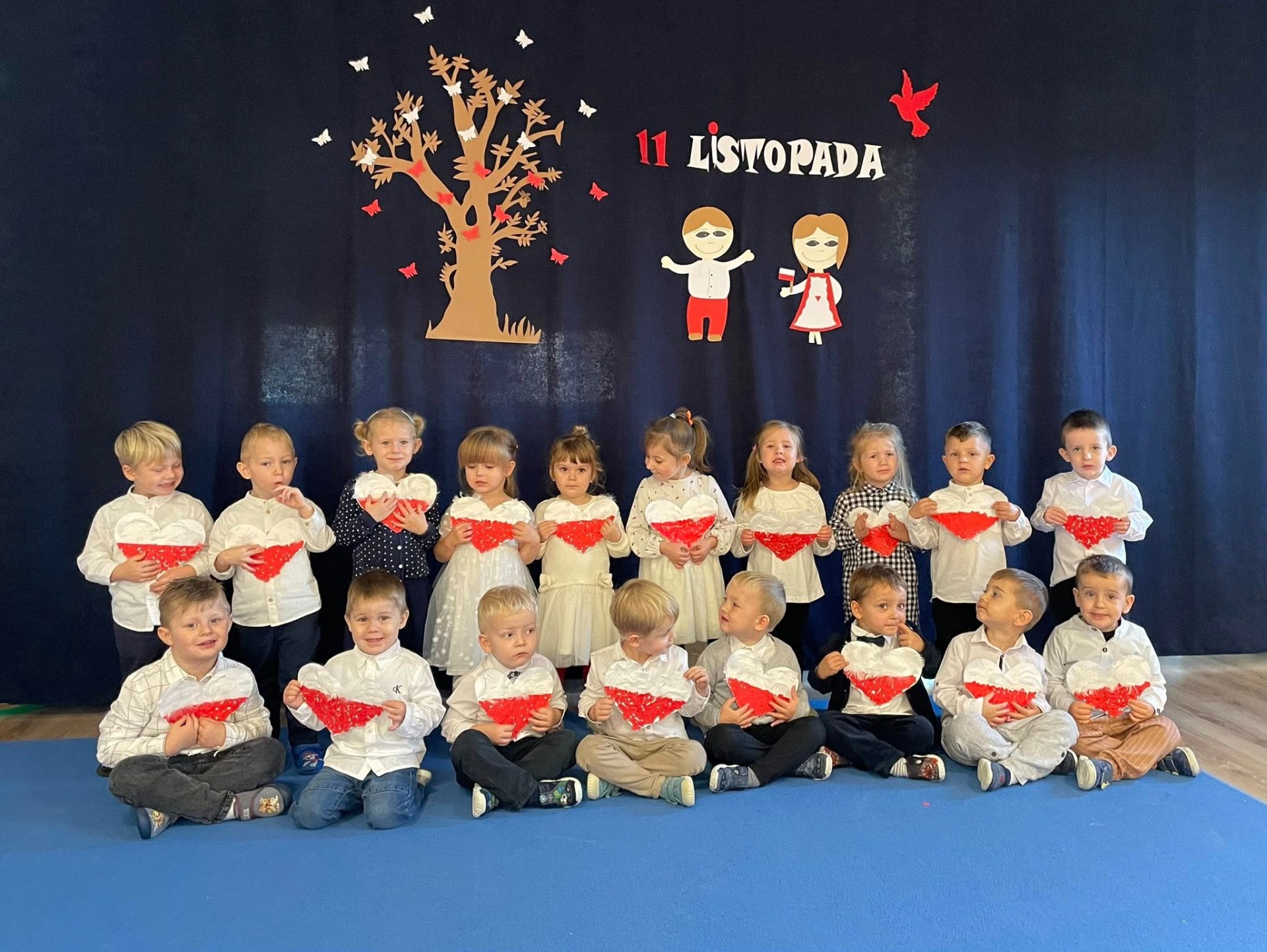 Nasze przedszkolaki pokazały, że w małych serduchach mieści się wielka duma! Dzieci wspólnie przypomniały sobie najważniejsze symbole narodowe oraz zaśpiewały "Mazurka Dąbrowskiego".
